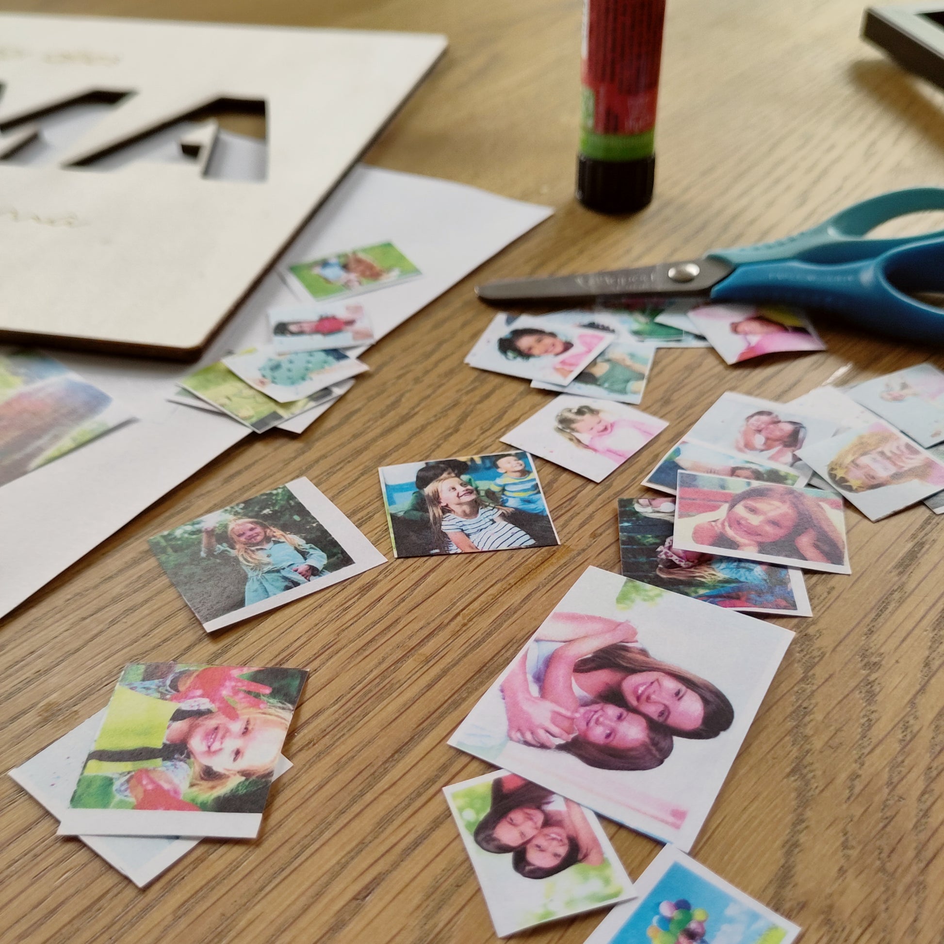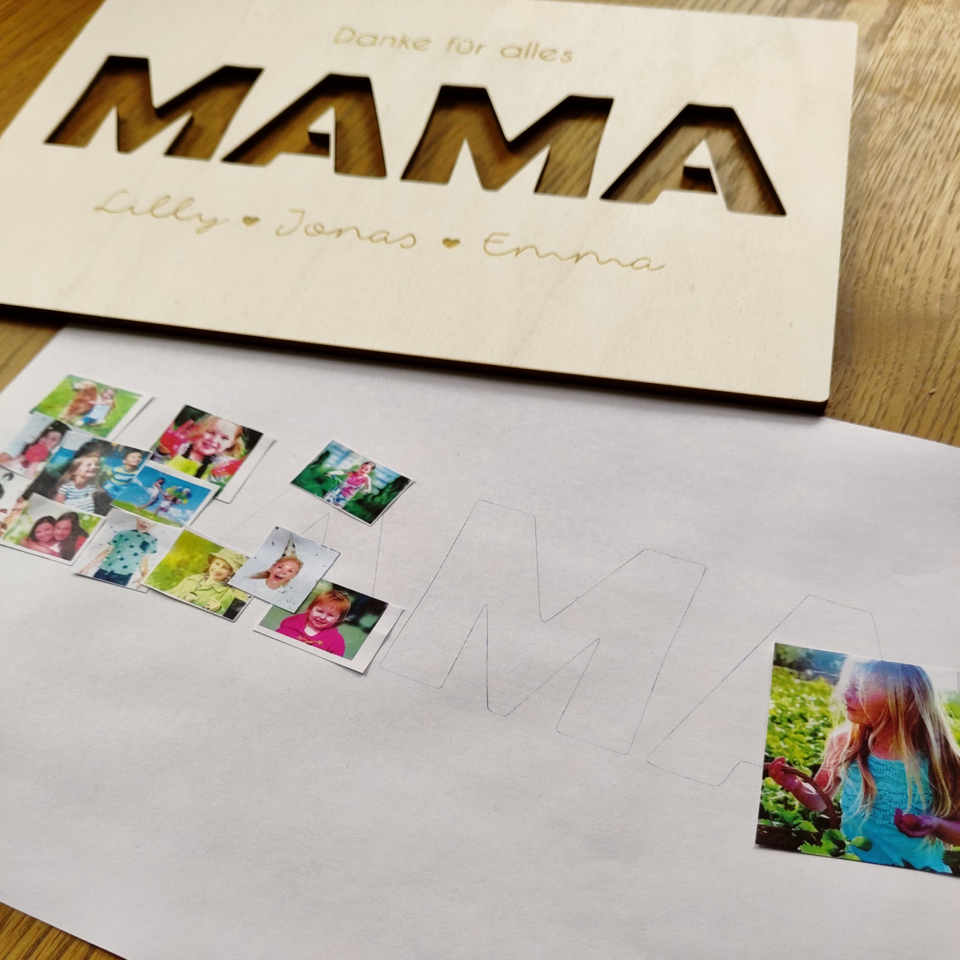 Das Motiv besteht aus 4 mm starkem Pappelholz und kommt zusammen mit einer Papier-Vorlage, um die Fotos aufzukleben und dem Rahmen. Also ein komplettes Set, um direkt loszulegen und ein einizgartiges Geschenk zu gestalten!