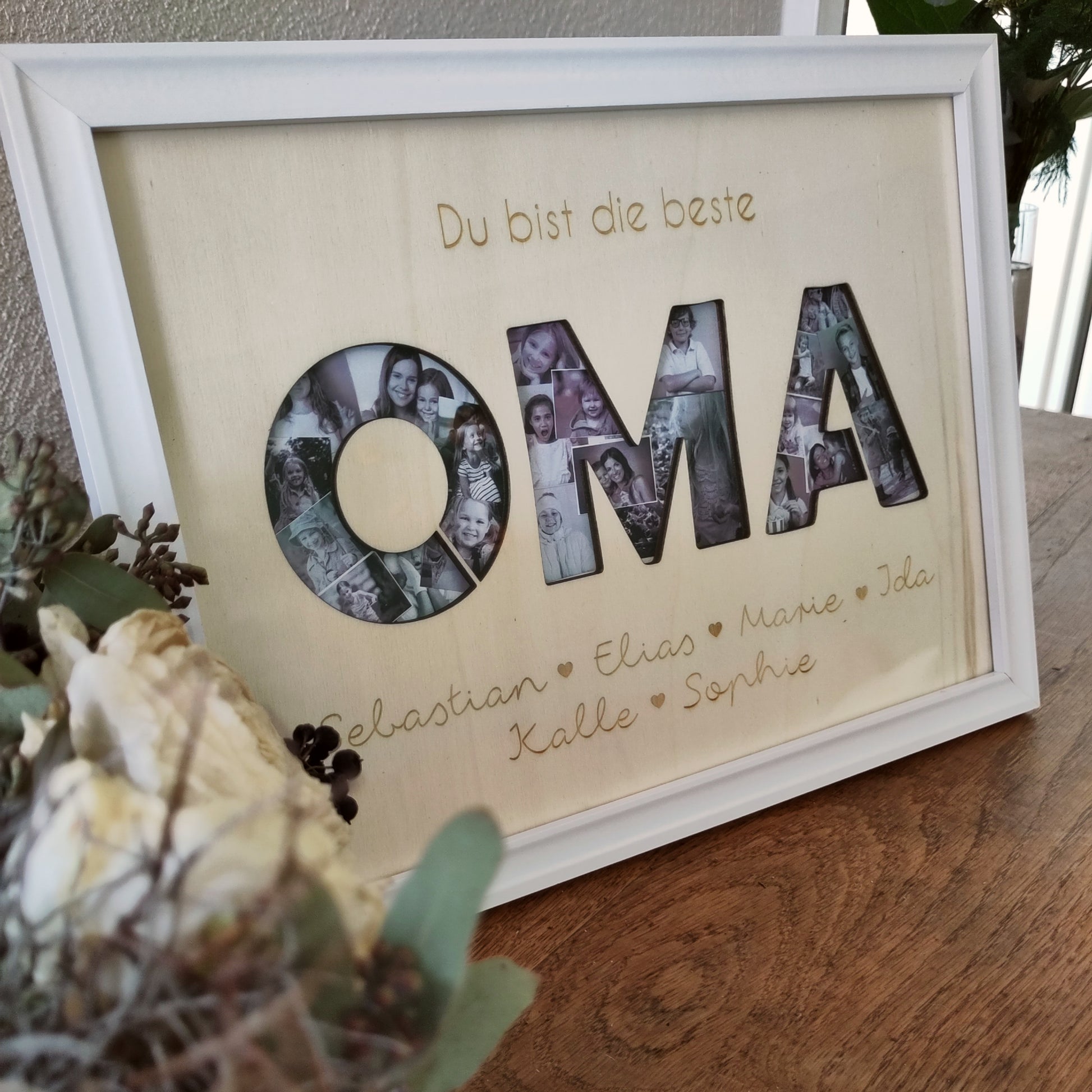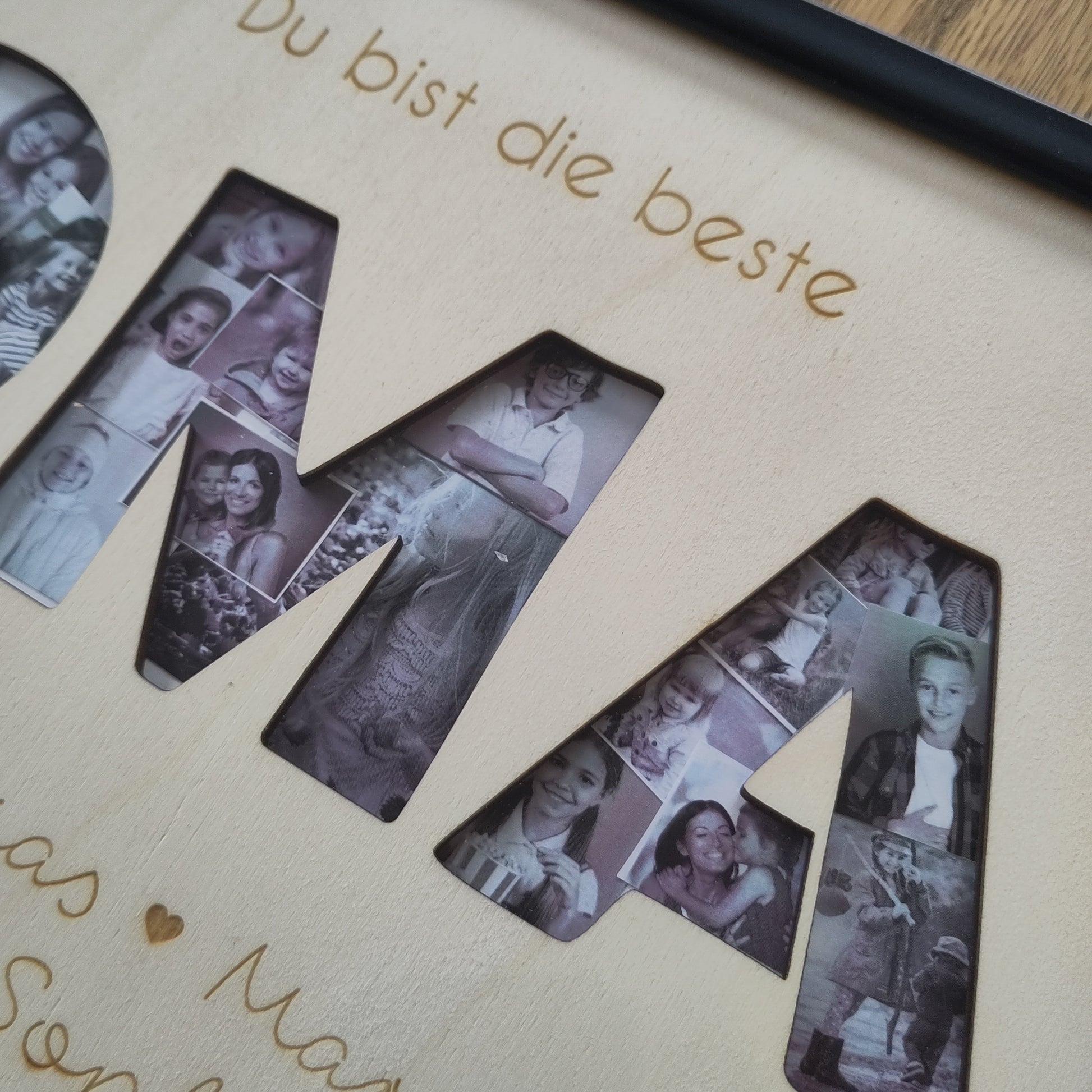 Das Wort Oma ist ausgeschnitten, so dass dahinter Fotos oder auch kleine Zeichnungen platziert werden können. Das perfekte Geschenk zum Muttertag oder einfach so 💚