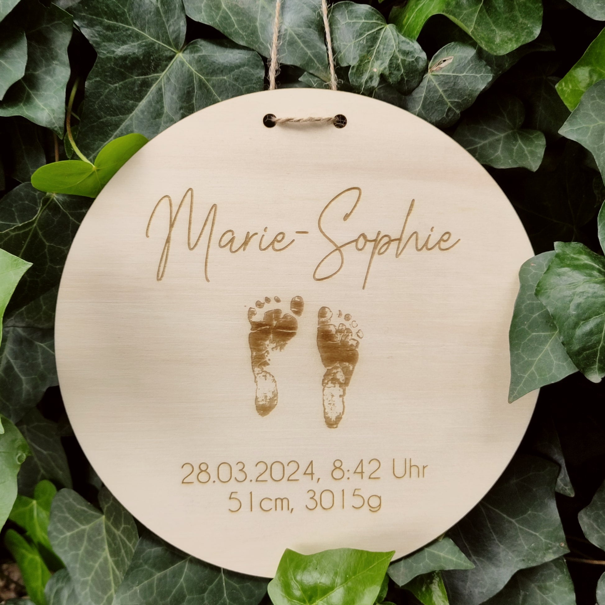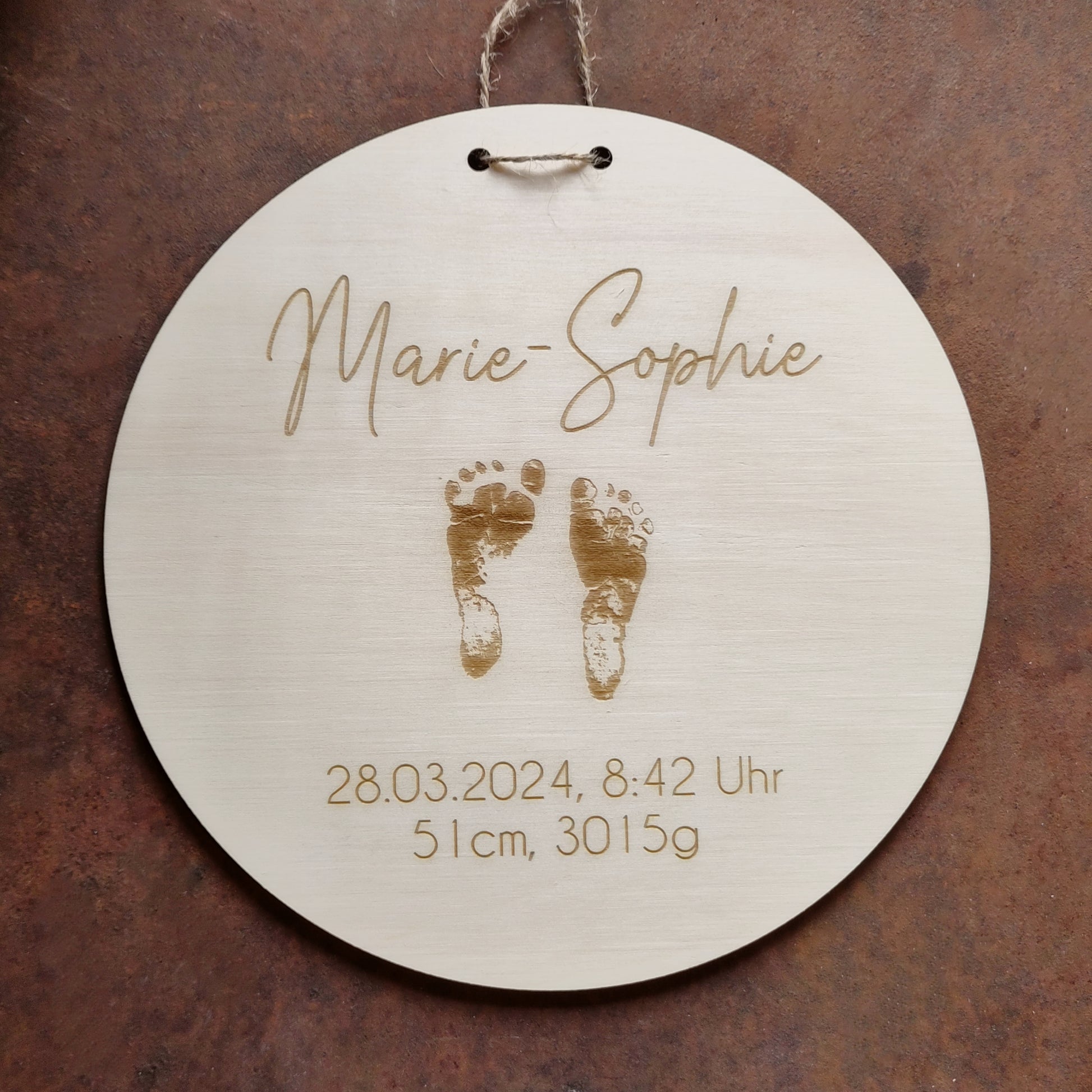 Individuelles Türschild mit den Fußabdrücken DEINES Babys! Wenn du zusätzlich mit angibst wie hoch der Abdruck ist, kann dieser sogar in Originalgröße aufs Holz.