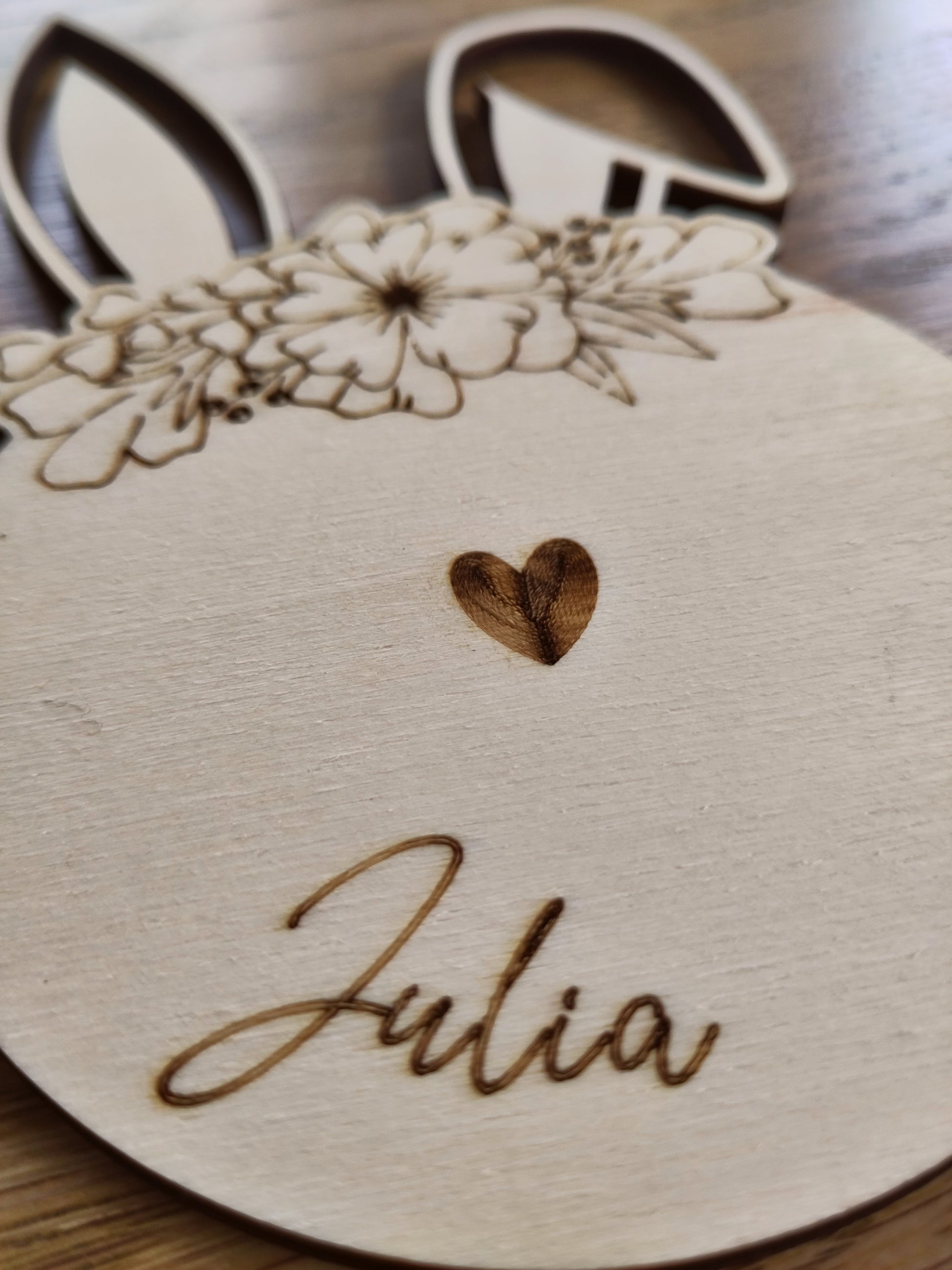 Der Wunschtext wird bei Tassen oder Flaschenöffner mittig auf die Rückseite des Artikels gedruckt, bei Holzelemente wird der Name wie im Bild eingearbeitet